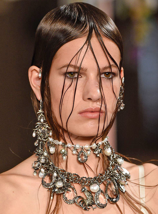One of the trends in the McQueen spring-summer collection was wispy, wet-look hair, as if the model had just come out of the water.