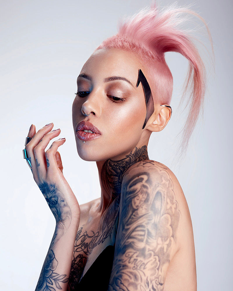 This stunning collection from Heather Nelson at Nelson Hairdressing is a finalist in the British Hairdressing Awards, Scottish category. Heather says: ‘Bionic Beauty is inspired by the never-ending cycle of fashion, pushing late 20th-century trends into the future. Powerful, feminine designs make dramatic use of strong cutting, contour and balayage techniques in soft metallic tones to create my vision, Bionic Beauty.’